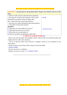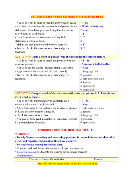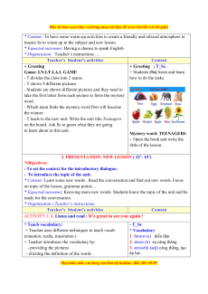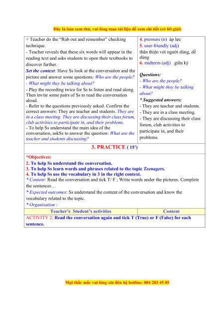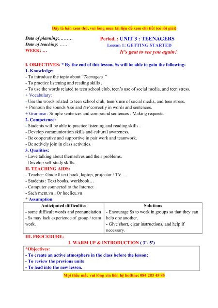 Đây là bản xem thử, vui lòng mua tài liệu để xem chi tiết (có lời giải) Date of planning:……… Period..: UNIT 3 : TEENAGERS Date of teaching: …… Lesson 1: GETTING STARTED WEEK: …