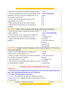 - Teacher checks the answers as a class and gives 2. pressure feedback. 3. arts and crafts club 4. forum 5. sports club 6. chess club