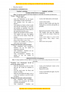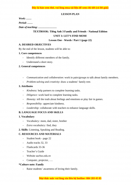 C. RESOURCES AND MATERIALS - Student book - page 22 - Audio tracks 32, 33 - Flashcards 33-36 - Teacher’s Guide - Website sachso.edu.vn - Computer, projector, …. *Culture note: Family -