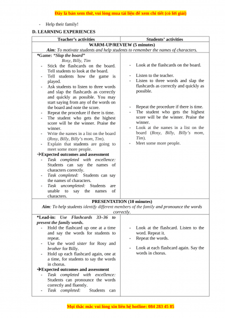 - Help their family! D. LEARNING EXPERIENCES Teacher’s activities Students’ activities