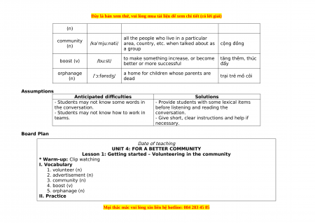 * Warm-up: Clip watching I. Vocabulary 1. volunteer (n) 2. advertisement (n) 3. community (n) 4. boost (v) 5. orphanage (n) II. Practice