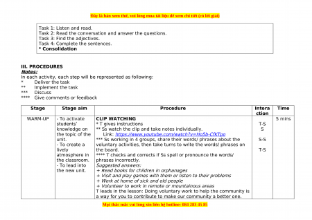 In each activity, each step will be represented as following: * Deliver the task ** Implement the task *** Discuss **** Give comments or feedback Stage Stage aim Procedure Intera Time ction WARM-UP - To activate CLIP WATCHING 5 mins students’ * T gives instructions T-S knowledge on