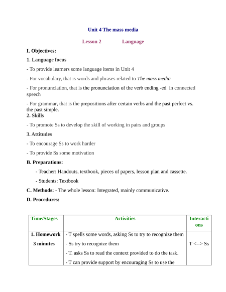 C. Methods: - The whole lesson: Integrated, mainly communicative. D. Procedures: Time/Stages Activities Interacti ons