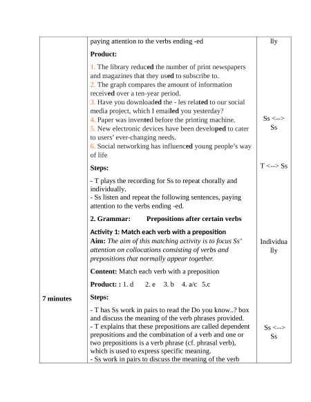 Content: Match each verb with a preposition Product: : 1. d 2. e 3. b 4. a/c 5.c 7 minutes Steps: