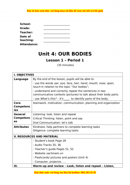 School: ____________________ Grade: ____________________ Teacher: ____________________ Date of ____________________ teaching: ____________________ Attendance: Unit 4: OUR BODIES Lesson 1 – Period 1 (35 minutes) I. OBJECTIVES Language
