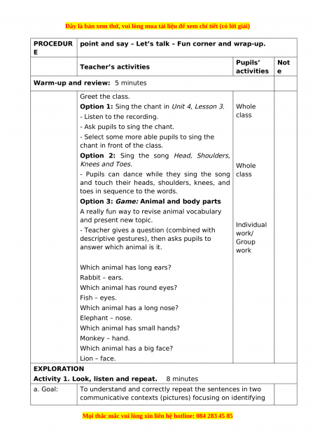 descriptive gestures), then asks pupils to Group answer which animal is it. work Which animal has long ears? Rabbit – ears. Which animal has round eyes? Fish – eyes. Which animal has a long nose? Elephant – nose. Which animal has small hands? Monkey – hand. Which animal has a big face? Lion – face. EXPLORATION