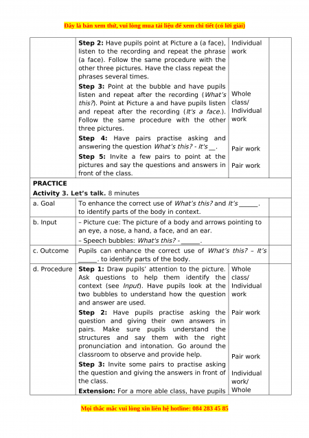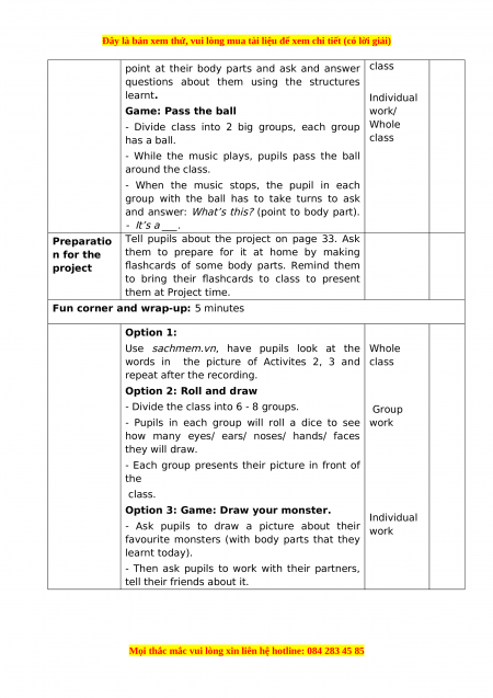 Step 1: Have pupils look at the pictures and Whole Procedure: elicit the parts of the body. class/
