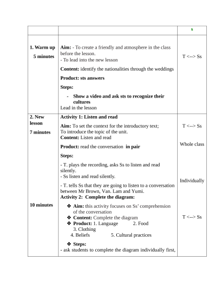 1. Warm up Aim: - To create a friendly and atmosphere in the class before the lesson. 5 minutes T <--> Ss - To lead into the new lesson