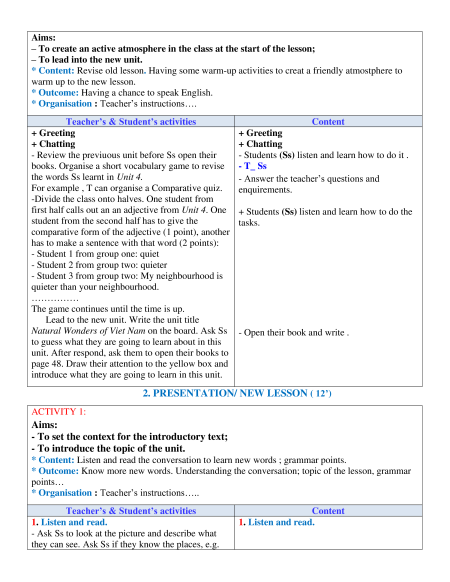 * Content: Revise old lesson. Having some warm-up activities to creat a friendly atmostphere to warm up to the new lesson.