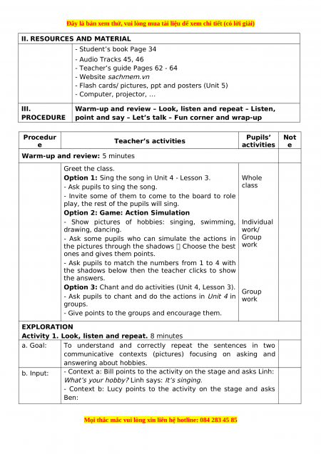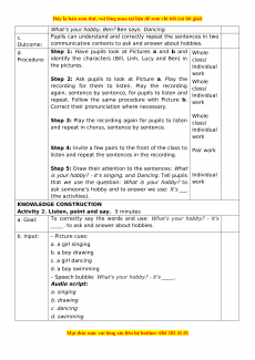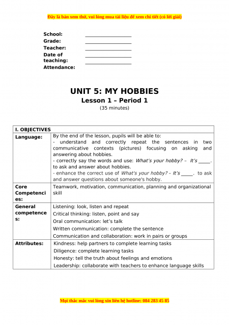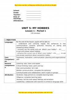 School: ____________________ Grade: ____________________ Teacher: ____________________ Date of ____________________ teaching: ____________________ Attendance: UNIT 5: MY HOBBIES Lesson 1 – Period 1 (35 minutes) I. OBJECTIVES Language: