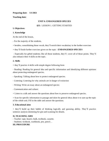 Giáo án Unit 6: Endangered species Tiếng Anh 12 (mới CV 5512)