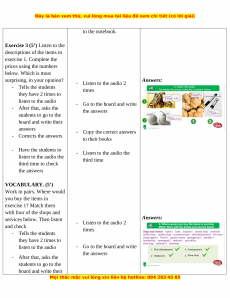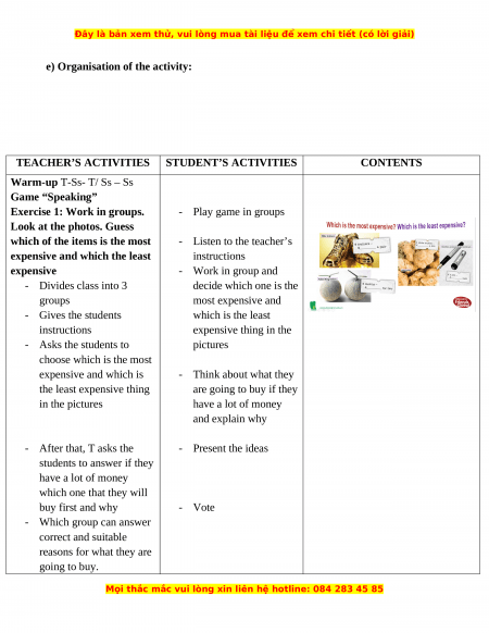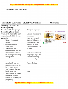 expensive and which the least instructions expensive - Work in group and - Divides class into 3 decide which one is the groups most expensive and - Gives the students which is the least instructions expensive thing in the - Asks the students to pictures choose which is the most expensive and which is - Think about what they the least expensive thing are going to buy if they in the pictures have a lot of money and explain why - After that, T asks the - Present the ideas students to answer if they have a lot of money which one that they will buy first and why - Vote - Which group can answer correct and suitable reasons for what they are going to buy.