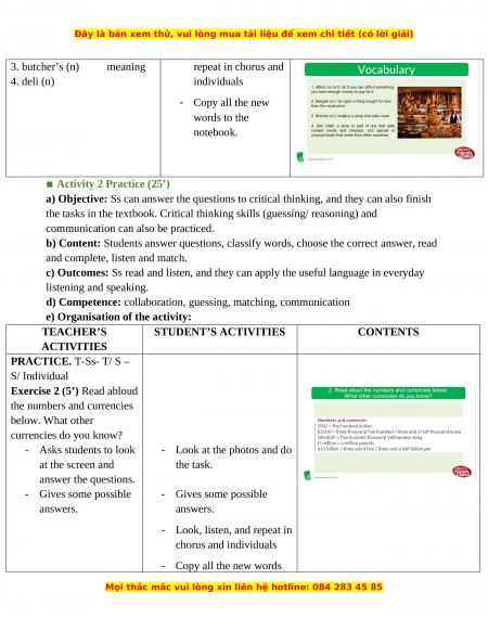 Exercise 2 (5’) Read abloud the numbers and currencies below. What other currencies do you know? - Asks students to look - Look at the photos and do at the screen and the task. answer the questions. - Gives some possible - Gives some possible answers. answers. - Look, listen, and repeat in chorus and individuals - Copy all the new words