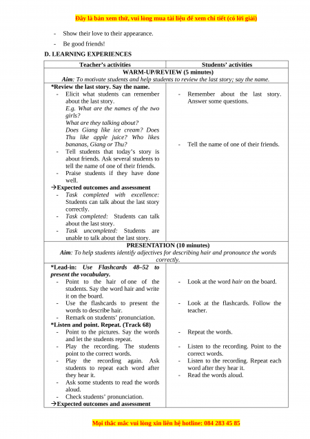 Show their love to their appearance. - Be good friends! D. LEARNING EXPERIENCES Teacher’s activities Students’ activities