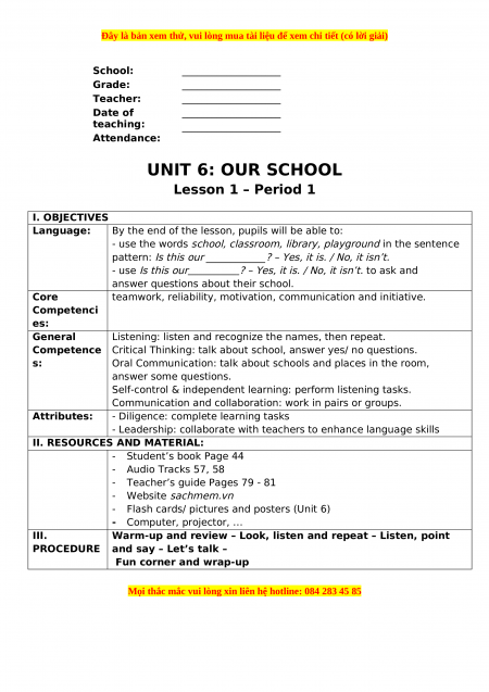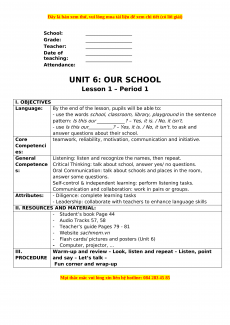 School: ____________________ Grade: ____________________ Teacher: ____________________ Date of ____________________ teaching: ____________________ Attendance: UNIT 6: OUR SCHOOL Lesson 1 – Period 1 I. OBJECTIVES Language: