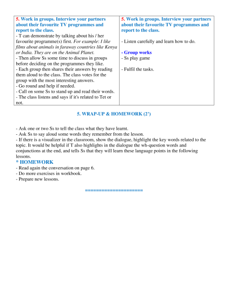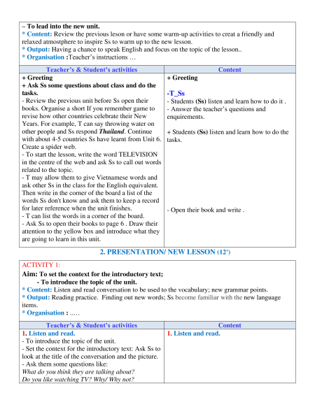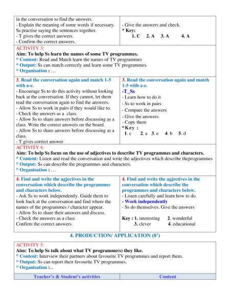 * Content: Listen and read conversation to be used to the vocabulary; new grammar points.
