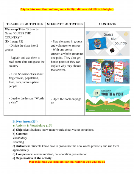 Warm-up T-Ss- T/ Ss – Ss Game “GUESS THE COUNTRY “ (Ex 1 page 82) - Play the game in groups - Divide the class into 2 and volunteer to answer groups - With one correct answer, a whole group get - Explain and ask them to one point. They also get read some clue and guess the bonus points if they can country explain why they choose that answer. - Give SS some clues about flag colours, population, food, cars, famous place, people