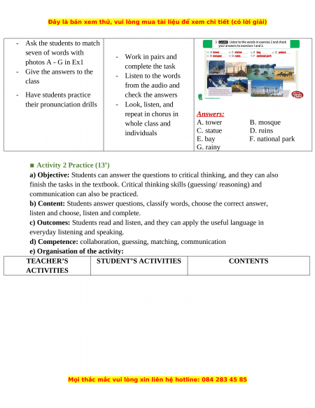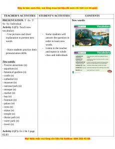 Activity 1 (5’): Teach new vocabulary - Use pictures and short - Some students will explanation to present new answer the question in words order to learn new words. - Listen to the teacher - Have students practice their and repeat in whole pronunciation drills class and individuals New words: