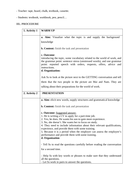 - Students: textbook, workbook, pen, pencil… III.. PROCEDURE 1. Activity 1 WARM UP