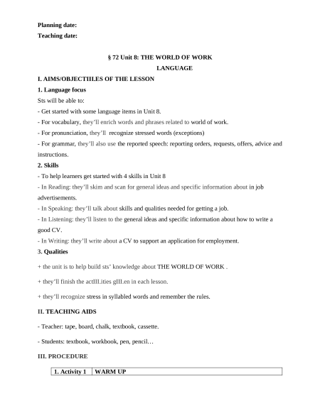 Giáo án Unit 8: The world of work Tiếng Anh 12 (mới CV 5512)