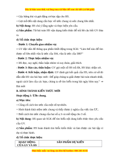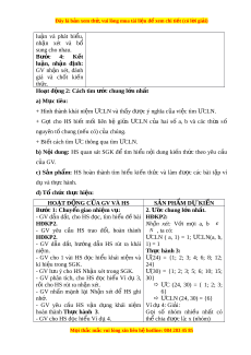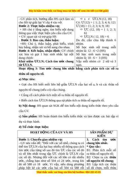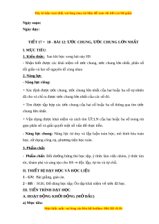 ả và hai số nguyên tố cùng nhau 2. Năng l c ự - Năng l c ri ự êng: + Xác đ nh ị đư c ợ ư c ớ chung, ư c ớ chung l n ớ nh t ấ c a ủ hai ho c ặ ba s ố t ự nhiên đã cho và chỉ ra đư c ợ ư c chung l ớ n nh ớ ất c a ủ các số đó. + Tìm đư c ợ t p ậ h p ợ các ư c ớ chung c a ủ hai số ho c ặ ba s ố thông qua tìm ư c ớ chung l n nh ớ ất. + V n ậ d ng ụ đư c ợ khái ni m ệ và cách tìm C Ư LN c a ủ hai ho c ặ ba số trong rút g n phân s ọ ố và gi i ả quy t ế m t ộ s v ố n đ ấ t ề h c t ự i n. ễ - Năng l c ự chung: Năng l c ự tư duy và l p ậ lu n ậ toán h c; ọ mô hình hóa toán h c, s ọ ử d ng công c ụ , ụ phư ng t ơ i n h ệ c t ọ oán. 3. Ph m ẩ chất - Phẩm ch t ấ : Bồi dư ng h ỡ ng t ứ hú h c ọ t p, ý t ậ h c l ứ àm vi c nhóm ệ , ý th c t ứ ìm
