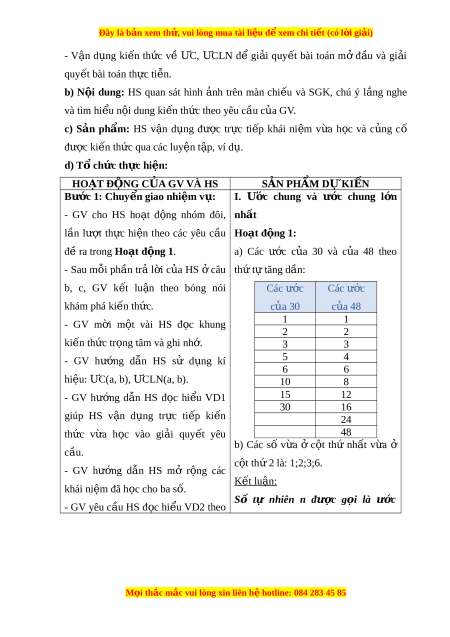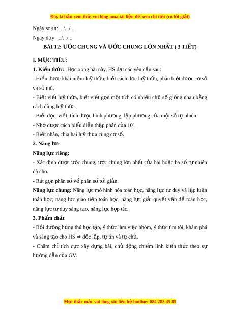 Đây là bản xem th , vu ử i lòng mua tài li u ệ đ xe ể m chi ti t ế (có l i ờ gi i ả ) Ngày so n: ạ .../.../... Ngày d y: ạ .../.../... BÀI 12: Ư C Ớ CHUNG VÀ Ư C Ớ CHUNG L N Ớ NH T Ấ ( 3 TI T Ế ) I. M C Ụ TIÊU: 1. Ki n t ế h c ứ : H c ọ xong bài này, HS đ t ạ các yêu c u s ầ au: - Hi u ể đư c ợ khái ni m ệ lu ỹ th a; ừ bi t ế cách đ c ọ lu t ỹ h a, ừ phân bi t ệ đư c ợ c s ơ ố và số mũ. - Bi t ế vi t ế luỹ th a, ừ bi t ế vi t ế g n ọ m t ộ tích có nhi u ề ch ữ s ố gi ng ố nhau b ng ằ cách dùng lu t ỹ h a. ừ - Bi t ế đ c, vi ọ t ế , tính đư c ợ bình phư ng, l ơ p ph ậ ư ng ơ c a m ủ t ộ số t nhi ự ên. - Nhớ đư c cách ợ bi u di ể n t ễ h p phân ậ c a 10 ủ n. - Bi t ế nhân, chia hai lu t ỹ h a ừ cùng c s ơ . ố 2. Năng l c ự Năng l c ự riêng: - Xác đ nh ị đư c ợ ư c ớ chung, ư c ớ chung l n ớ nh t ấ c a ủ hai ho c ặ ba s ố t ự nhiên đã cho. - Rút g n phân s ọ ố v phân ề số tối gi n. ả Năng l c ự chung: Năng l c ự mô hình hóa toán h c, ọ năng l c ự t ư duy và l p ậ lu n ậ toán h c; ọ năng l c ự giao ti p ế toán h c; ọ năng l c ự gi i ả quy t ế v n ấ đề toán h c, ọ năng l c t ự duy s ư áng t o, năng ạ l c h ự p t ợ ác. 3. Ph m ẩ chất - Bồi dư ng ỡ h ng t ứ hú h c t ọ p, ậ ý th c l ứ àm vi c nhóm ệ , ý th c t ứ ìm tòi, khám phá và sáng t o cho H ạ S ⇒ đ c l ộ p, ậ t t ự in và t ch ự . ủ - Chăm chỉ tích c c ự xây d ng ự bài, chủ đ ng ộ chi m ế lĩnh ki n ế th c ứ theo sự hư ng d ớ ẫn c a G ủ V. M i ọ thắc m c