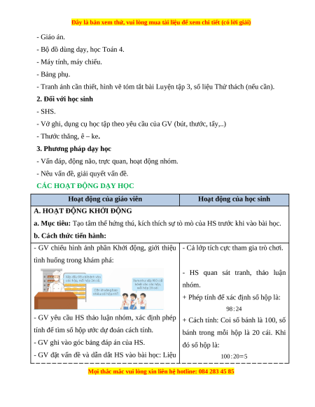 - Tranh ảnh cần thiết, hình vẽ tóm tắt bài Luyện tập 3, số liệu Thử thách (nếu cần).