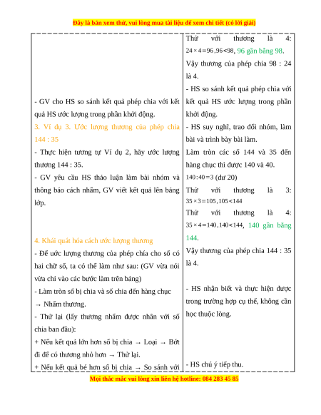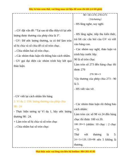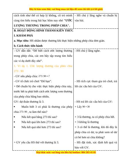 Giáo án Ước lượng thương trong phép chia Toán lớp 4 Chân trời sáng tạo