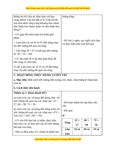 a. Mục tiêu: Biết cách ước lượng tính (cộng, trừ, nhân, chia) bằng kĩ thuật làm tròn số.