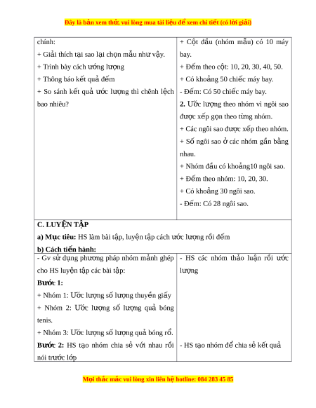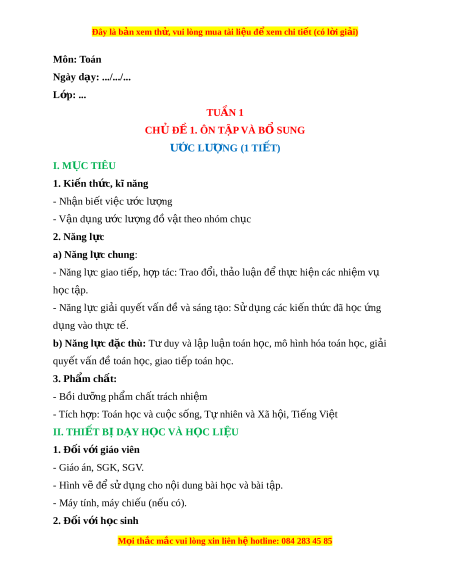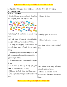 ƯỚC LƯỢNG (1 TIẾT) I. M C Ụ TIÊU 1. Ki n t ế h c, kĩ ứ năng - Nh n bi ậ t ế vi c ệ ư c ớ lư ng ợ - V n ậ d ng ụ ư c ớ lư ng đ ợ v ồ t ậ theo nhóm ch c ụ 2. Năng l c ự a) Năng l c ự chung: - Năng l c gi ự ao ti p, h ế p ợ tác: Trao đ i ổ , th o ả lu n đ ậ t ể h c ự hi n các ệ nhi m ệ v ụ h c ọ t p. ậ - Năng l c gi ự i ả quy t ế v n đ ấ và s ề áng t o: ạ S d ử ng các ụ ki n ế th c đã h ứ c ọ ng ứ d ng vào ụ th c t ự . ế b) Năng l c đ ự c t ặ hù: T duy và ư l p l ậ u n t ậ oán h c, m ọ ô hình hóa toán h c, gi ọ i ả quy t ế v n đ ấ t ề oán h c, ọ giao ti p t ế oán h c. ọ 3. Phẩm ch t ấ : - Bồi dư ng ph ỡ m ẩ ch t ấ trách nhi m ệ - Tích h p: ợ Toán h c và cu ọ c ộ s ng, ố T nhi ự ên và Xã h i ộ , Ti ng ế Vi t ệ II. THIẾT B D Ị ẠY H C Ọ VÀ H C Ọ LI U Ệ 1. Đ i ố v i ớ giáo viên - Giáo án, SGK, SGV. - Hình v đ ẽ s ể ử d ng cho n ụ i ộ dung bài h c ọ và bài t p. ậ - Máy tính, máy chi u ế (n u có) ế . 2. Đ i ố v i ớ h c s ọ inh M i