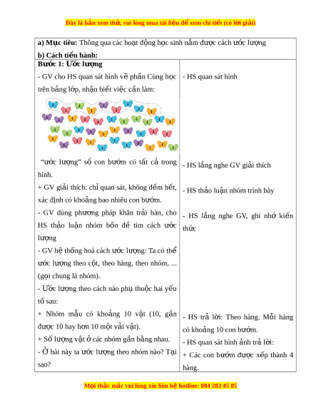ụ iêu: Thông qua các ho t ạ đ ng h ộ c ọ sinh n m ắ đư c ợ cách ước lư ng ợ b) Cách ti n hành ế : Bước 1: Ư c l ớ ư ng ợ - GV cho HS quan sát hình v ẽ ph n ầ Cùng h c ọ - HS quan sát hình trên b ng l ả p, ớ nh n bi ậ t ế vi c c ệ n l ầ àm: “ước lư ng” ợ số con bư m ớ có t t ấ cả trong - HS l ng ắ nghe GV gi i ả thích hình. + GV gi i