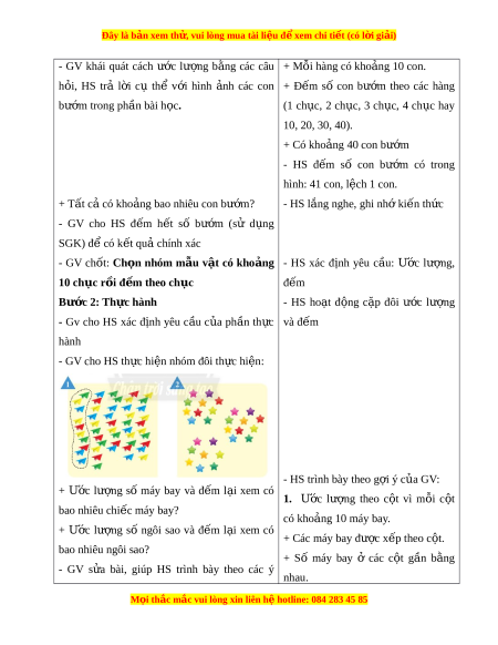Bước 2: Thực hành - HS ho t ạ đ ng ộ c p ặ đôi ư c ớ lư ng ợ - Gv cho HS xác đ nh ị yêu c u ầ c a ủ ph n ầ th c ự và đ m ế hành - GV cho HS th c hi ự n nhóm ệ đôi th c ự hi n: ệ - HS trình bày theo g i ợ ý c a ủ GV: + c Ướ lư ng ợ số máy bay và đ m ế l i ạ xem có 1. c Ướ lư ng ợ theo c t ộ vì m i ỗ c t ộ bao nhiêu chi c m ế áy bay? có kho ng 10 m ả áy bay. + c Ướ lư ng ợ số ngôi sao và đ m ế l i