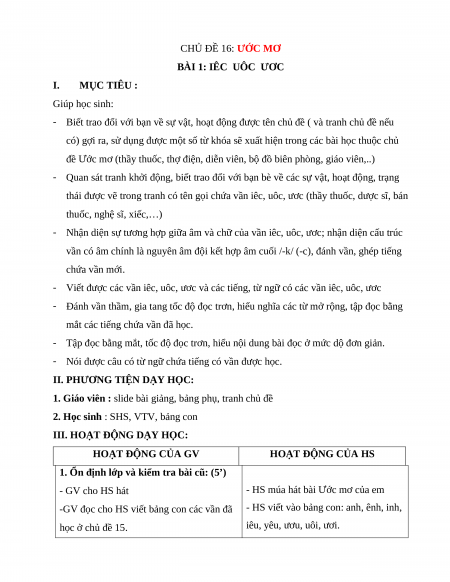 CHỦ ĐỀ 16: ƯỚC MƠ BÀI 1: IÊC UÔC ƯƠC I. MỤC TIÊU : Giúp học sinh: