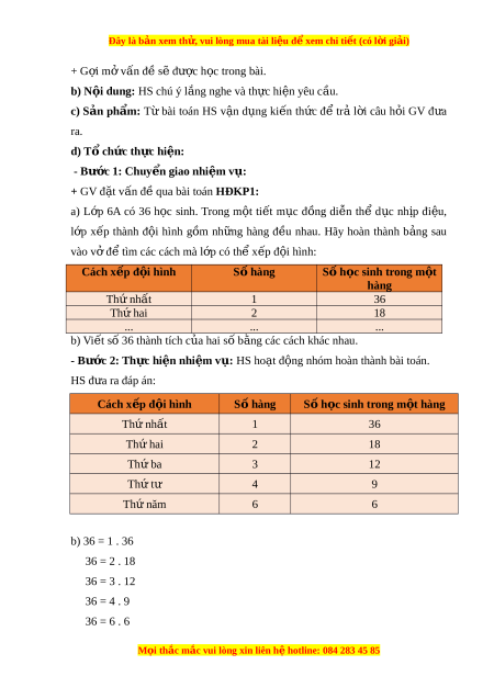 d) Tổ chức thực hi n: ệ - Bước 1: Chuy n gi ể ao nhi m ệ v : ụ + GV đ t ặ v n đ ấ qua bài ề toán HĐKP1: a) L p ớ 6A có 36 h c ọ sinh. Trong m t ộ ti t ế m c ụ đ ng ồ di n ễ thể d c ụ nh p ị đi u, ệ l p ớ x p ế thành đ i ộ hình g m ồ nh ng ữ hàng đ u