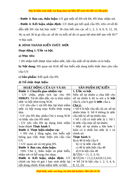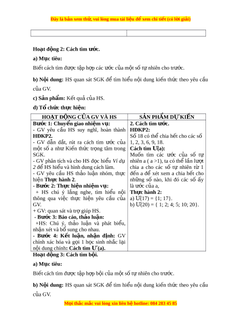Đây là bản xem th , vu ử i lòng mua tài li u ệ đ xe ể m chi ti t ế (có l i ờ gi i ả ) Hoạt đ ng 2: ộ Cách tìm ư c. ớ a) M c t ụ iêu: Bi t ế cách tìm được t p h ậ p ợ các ư c ớ c a m ủ t ộ số t nhi ự ên cho trư c. ớ b) N i