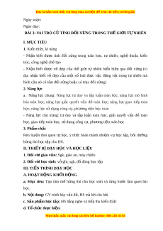 BÀI 3: VAI TRÒ CỦ TÍNH Đ I Ố X N Ứ G TRONG TH G Ế I I Ớ T N Ự HIÊN I. M C Ụ TIÊU 1. Ki n t ế h c, kĩ ứ năng - Nh n ậ bi t ế đư c ợ tính đ i ố x ng ứ trong toán h c, ọ tự nhiên, nghệ thu t ậ , ki n ế trúc, công ngh ch ệ ế t o ạ - Nh n ậ bi t ế đư c ợ vẻ đ p ẹ c a ủ thế gi i ớ tự nhiên bi u ể hi n ệ qua đ i ố x ng ứ (ví d : ụ nh n ậ bi t ế vẻ đ p ẹ c a ủ m t ộ số loài th c ự v t ậ , đ ng ộ v t ậ trong tự nhiên mà hình c a nó có t ủ âm đối x ng ho ứ c ặ có tr c ụ đ i ố x ng) ứ 2. Năng l c ự a. Năng l c ự chung: Năng l c ự tư duy và l p ậ lu n ậ toán h c; ọ năng l c ự mô hình hóa toán h c; ọ năng l c ự gi i ả quy t ế v n ấ đề toán h c; ọ năng l c ự giao ti p ế toán h c; ọ năng l c ự s d ử ng ụ công c , ph ụ ư ng ơ ti n ệ h c ọ toán - Năng l c ự chú tr ng: ọ tư duy và l p ậ lu n ậ toán h c, ọ gi i ả quy t ế v n ấ đề toán h c, gi ọ ao ti p t ế oán h c, ọ s d ử ng ụ công c , ph ụ ư ng ơ ti n t ệ oán h c ọ 3. Ph m ẩ chất Rèn luy n ệ thói quen tự h c, ọ ý th c ứ hoàn thành nhi m ệ vụ h c ọ t p, ậ b i ồ dư ng ỡ h ng t ứ hú h c t ọ p ậ cho HS.