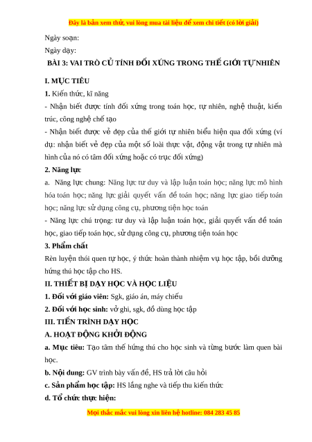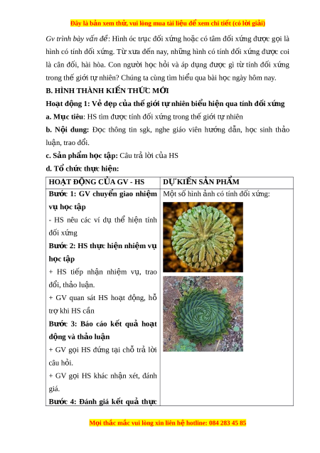 Đây là bản xem th , vu ử i lòng mua tài li u ệ đ xe ể m chi ti t ế (có l i ờ gi i ả ) hi n nhi ệ m ệ v h ụ c ọ t p ậ + GV đánh giá, nh n ậ xét, chu n ẩ ki n ế th c, ứ chuy n ể sang n i ộ dung m i ớ Hoạt đ ng ộ 2: Tính đ i ố x ng t ứ rong khoa h c kĩ ọ thu t ậ và đ i ờ s ng ố a. M c ụ tiêu: Con ngư i ờ sử d ng ụ tính đ i ố x ng ứ để áp d ng ụ vào đ i ờ s ng, ố công nghệ kĩ thu t ậ b. N i ộ dung: Đ c