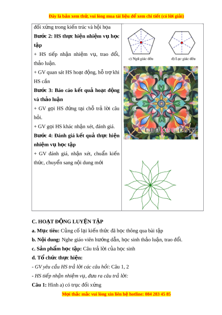 Đây là bản xem th , vu ử i lòng mua tài li u ệ đ xe ể m chi ti t ế (có l i ờ gi i ả ) đối x ng ứ trong ki n t ế rúc và h i ộ h a ọ Bư c ớ 2: HS th c ự hi n ệ nhi m ệ vụ h c ọ tập + HS ti p ế nh n ậ nhi m ệ v , ụ trao đ i ổ , th o l ả u n. ậ + GV quan sát HS ho t ạ đ ng, ộ h t ỗ r khi ợ HS c n ầ Bư c ớ 3: Báo cáo k t ế quả ho t ạ đ ng ộ và thảo luận + GV g i ọ HS đ ng ứ t i ạ chỗ trả l i ờ câu h i ỏ . + GV g i ọ HS khác nh n xét ậ , đánh giá. Bư c ớ 4: Đánh giá k t ế quả th c ự hi n ệ nhi m ệ v h ụ c t ọ p ậ + GV đánh giá, nh n ậ xét, chu n ẩ ki n ế th c, chuy ứ n s ể ang n i ộ dung m i ớ C. HOẠT Đ N Ộ G LUY N Ệ T P Ậ a. Mục tiêu: C ng c ủ ố l i ạ ki n ế th c đã h ứ c t ọ hông qua bài t p ậ b. N i