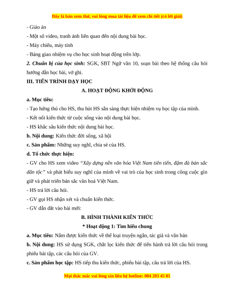 2. Chuẩn bị của học sinh: SGK, SBT Ngữ văn 10, soạn bài theo hệ thống câu hỏi