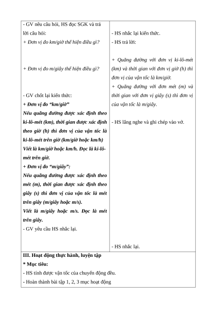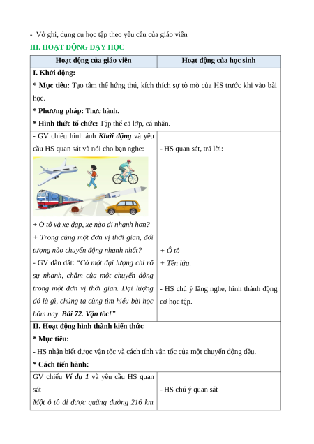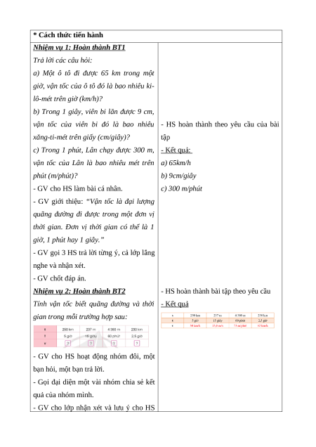 - HS nhận biết được vận tốc và cách tính vận tốc của một chuyển động đều. * Cách tiến hành: