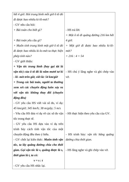 đi được bao nhiêu ki-lo-mét ta thực hiện mét? phép tính nào? + 216 : 4 = 54 - GV giới thiệu: