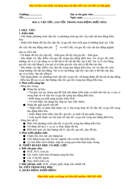 Ngày soạn …………………… BÀI 3: V N Ậ T C Ố , GIA T C Ố TRONG DAO Đ N Ộ G ĐI U Ề HÒA I. MỤC TIÊU 1. Ki n ế th c ứ - Viết đư c ợ phư ng ơ trình v n ậ t c ố và phư ng ơ trình gia t c ố c a ủ m t ộ v t ậ dao đ ng ộ đi u ề hòa. - Nhận bi t ế đư c ợ đồ thị c a ủ v n ậ t c ố và gia t c ố theo th i ờ gian là đư ng ờ hình sin. V n ậ π t c ố của vật dao đ ng s ộ m ớ pha so với li đ , c ộ òn gia t c ố c a ủ v t ậ dao đ ng ộ ngư c ợ 2 pha so v i ớ li đ . ộ - V đ ẽ ược đ t ồ h c ị a ủ v n t ậ c ố – th i ờ gian; đ t ồ h c ị a ủ gia t c ố – th i ờ gian. - Nêu đư c ợ các đ c ặ đi m ể c a ủ gia t c ố trong dao đ ng ộ đi u ề hòa: véc tơ gia t c ố luôn hư ng ớ về vị trí cân b ng ằ và có độ l n ớ tỉ lệ v i ớ đ ộ l n ớ c a ủ li đ . ộ T i ạ v ịtrí cân b ng, ằ gia t c