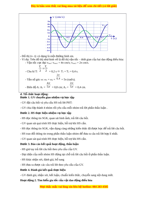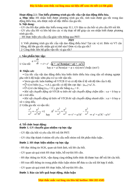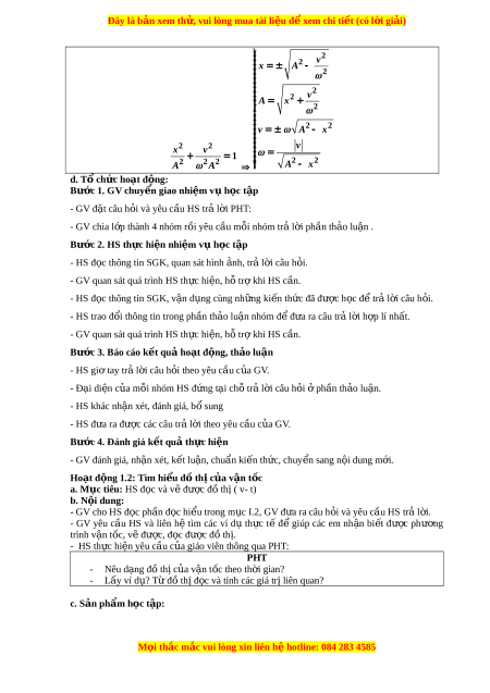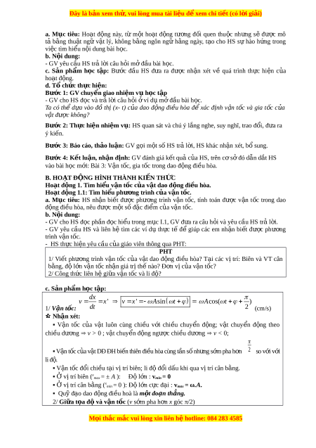 ị h: GV đánh giá k t ế quả c a ủ HS, trên c s ơ đó d ở n d ẫ t ắ HS vào bài h c ọ mới: Bài 3: V n t ậ c ố , gia t c ố trong dao đ ng đi ộ u hòa ề . B. HO T Ạ Đ N Ộ G HÌNH THÀNH KI N Ế TH C Ứ Hoạt đ n ộ g 1. Tìm hi u ể v n ậ t c ố c a ủ v t d ậ ao đ n ộ g đi u ề hòa. Hoạt đ n ộ g 1.1: Tìm hi u ể phư n ơ g trình c a ủ v n ậ t c ố .