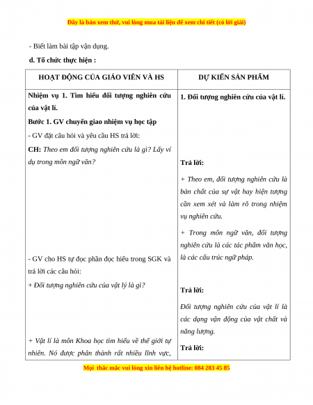 - HS nêu được được đối tượng, mục tiêu, phương pháp nghiên cứu của vật lí và biết lấy ví dụ chứng minh.