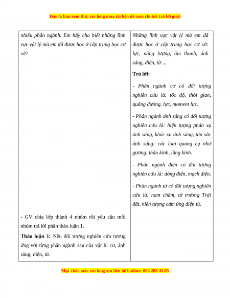 - GV đưa ra câu hỏi để HS trả lời: Hãy kể tên các lĩnh vực vật lý mà em đã được học ở