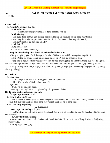 NS: BÀI 16: TRUYỀN TẢI ĐIỆN NĂNG. MÁY BIẾN ÁP. Tiết: 30. I. MỤC TIÊU: