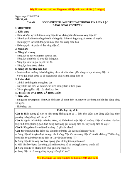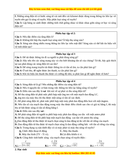 - Bài giảng powerpoint kèm:Các hình ảnh về sóng điện từ, nguyên tắc thông tin liên lạc bằng sóng vô tuyến. - Phiếu học tập.
