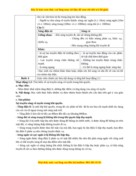 Câu 5: Lập bảng so sánh được những tính chất giống nhau và khác nhau giữa sóng cơ học và sóng