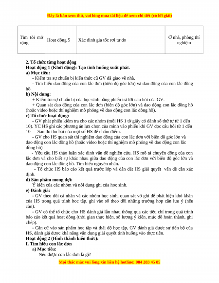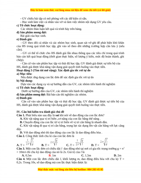 - Quan sát và làm thí nghiệm đơn giản về con lắc đơn. Thí nghiệm xác định gia tốc rơi
