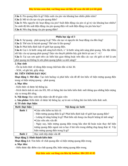 Câu 1. Pin quang điện (còn gọi là pin Mặt Trời) là một nguồn điện chạy bằng